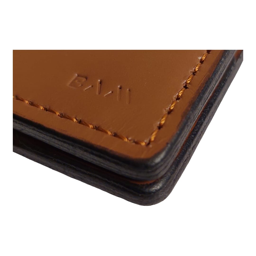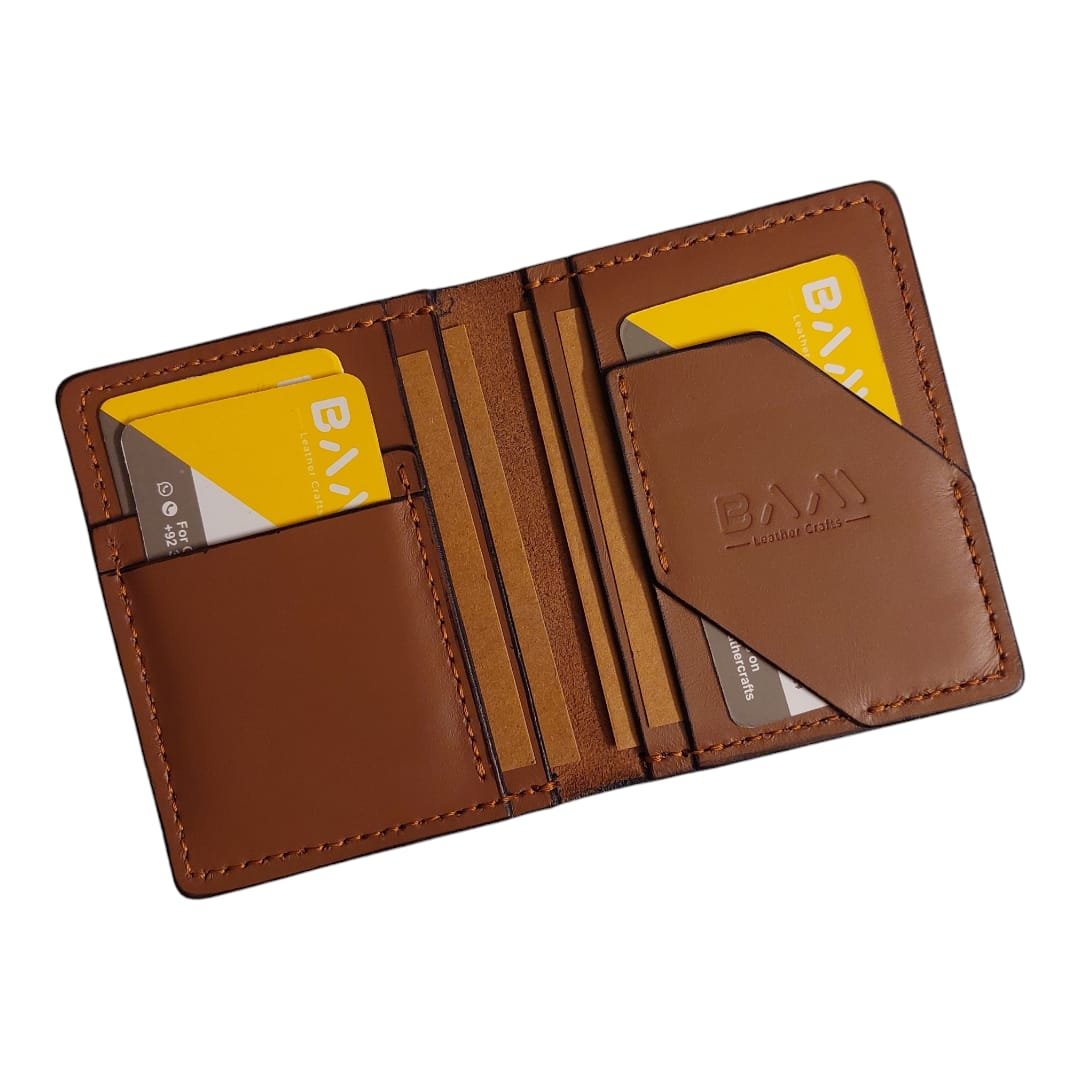 Bifold card holder having 3 card slots and 4 hidden pockets.
