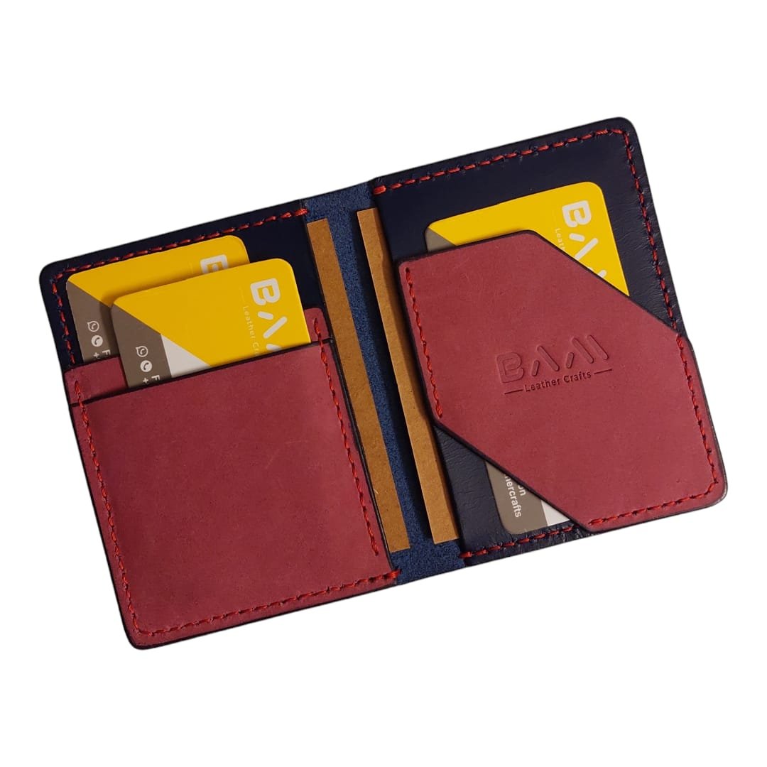 Bifold card holder having 3 card slots and 2 hidden pockets.