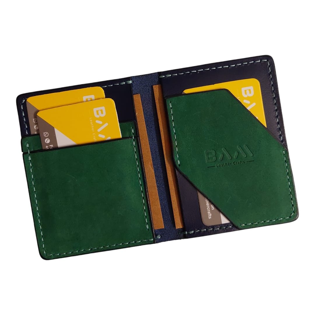 Bifold card holder having 3 card slots and 2 hidden  pockets.