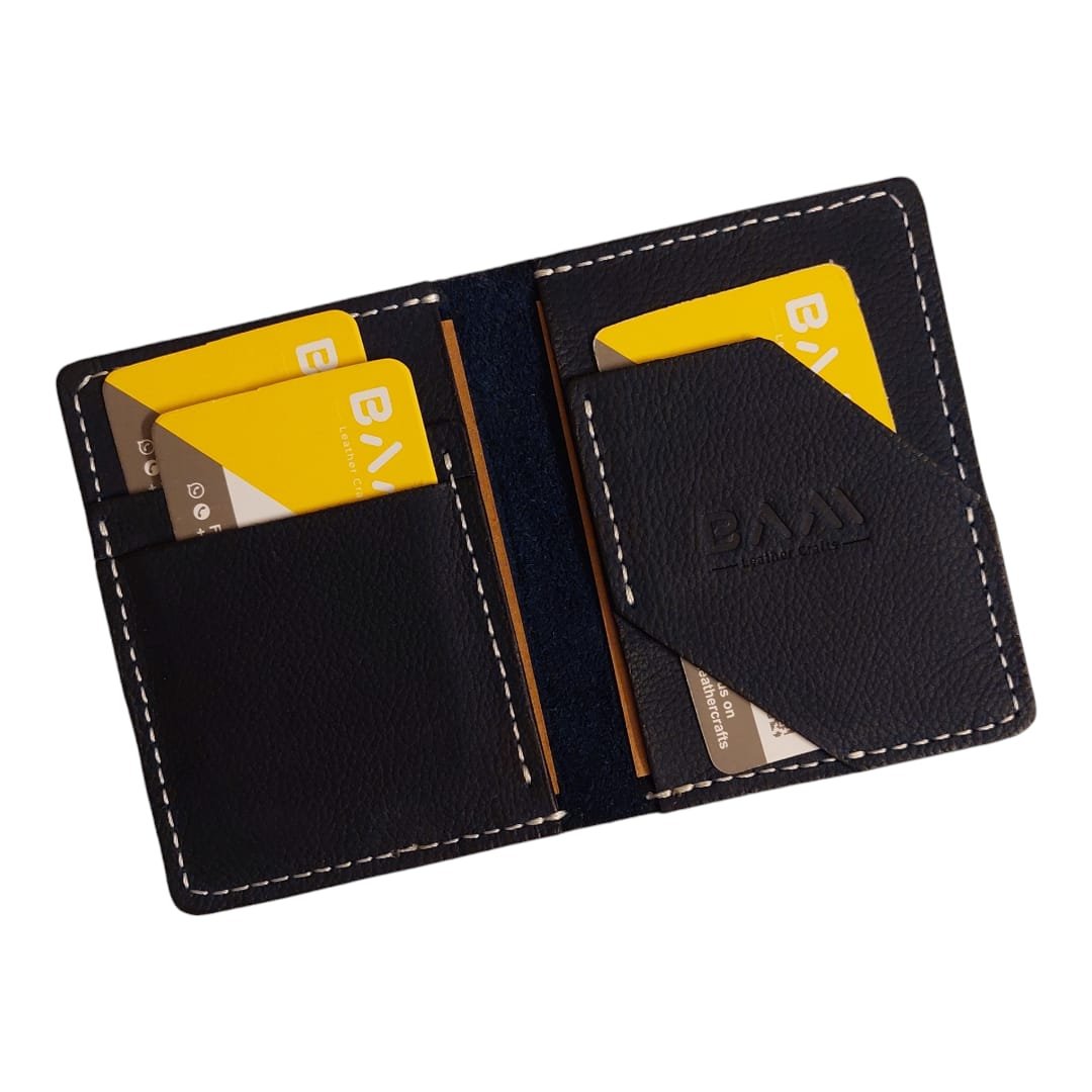 Bifold card holder having 3 card slots and 2 hidden  pockets.
