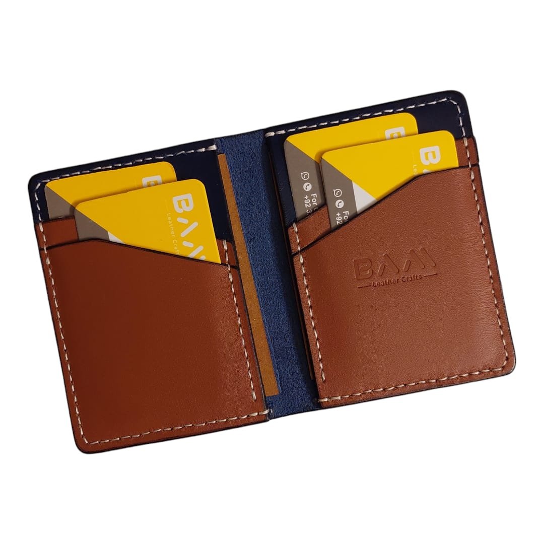 Bifold card holder having 3 card slots and 2 hidden pockets.