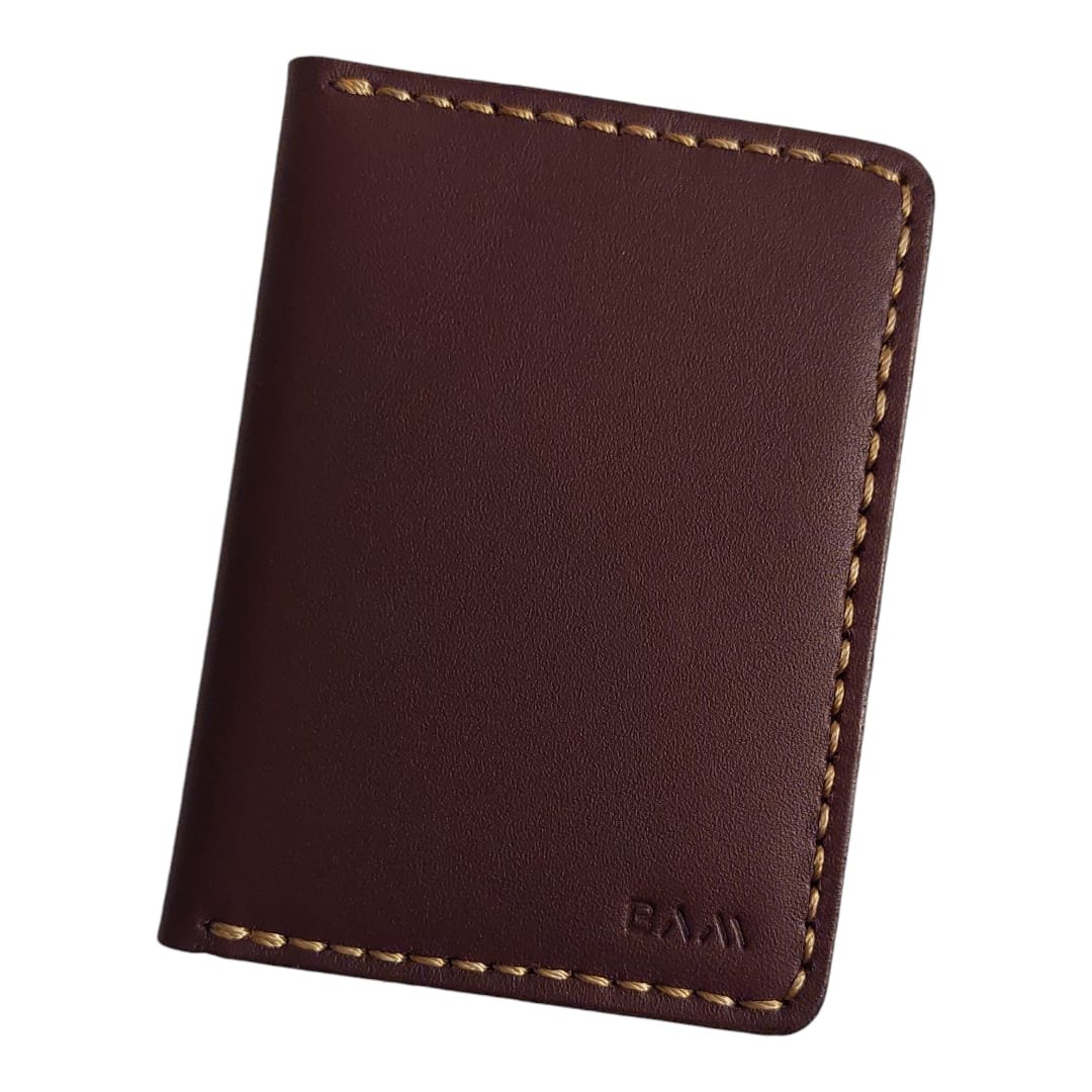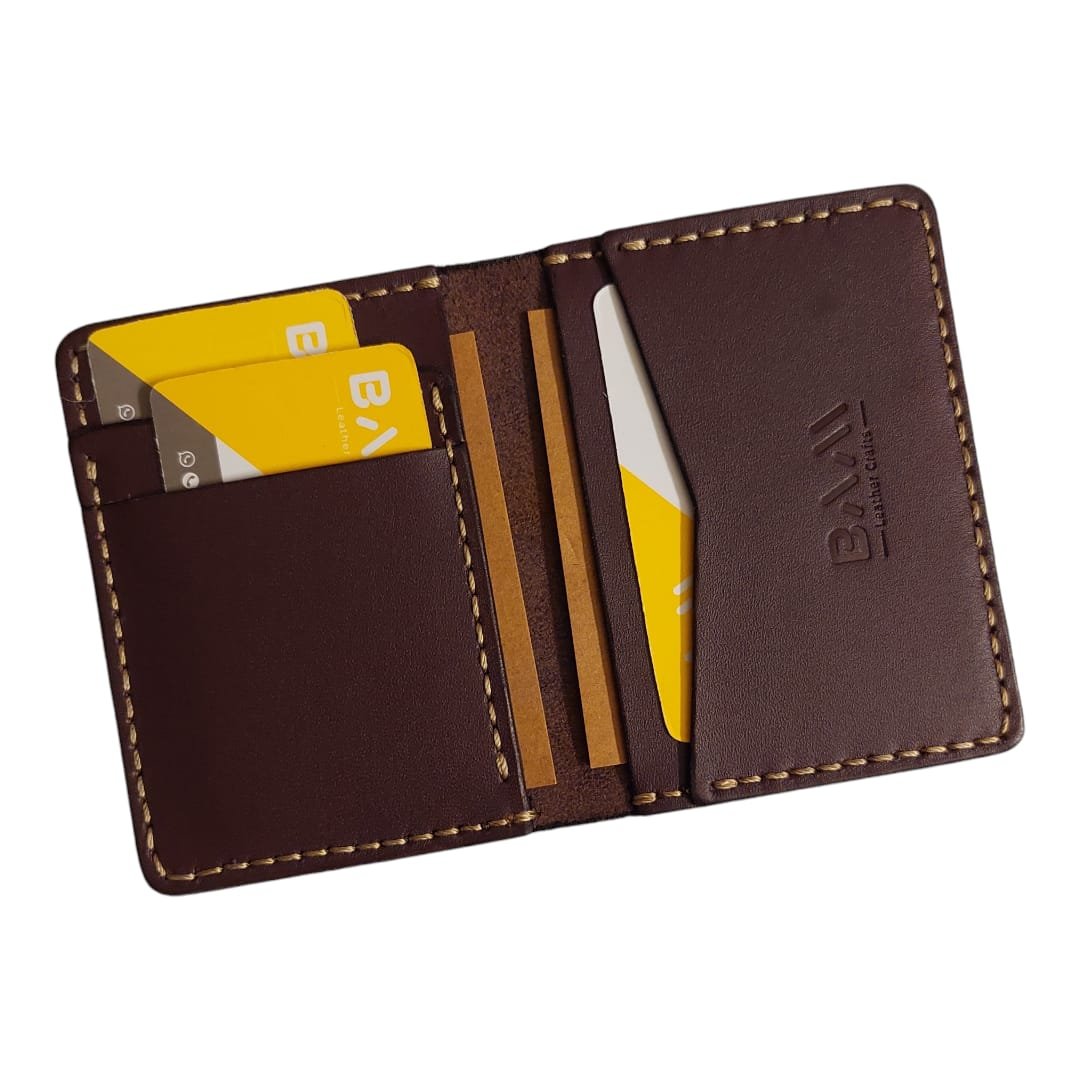 Bifold card holder having 3 card slots and 2 hidden pockets.