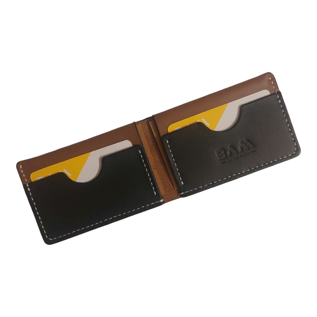 Bifold card holder having 2 card slots and 2 hidden pockets.