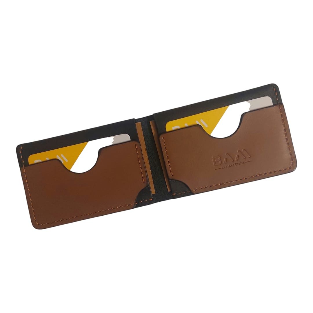 Bifold card holder having 2 card slots and 2 hidden pockets.