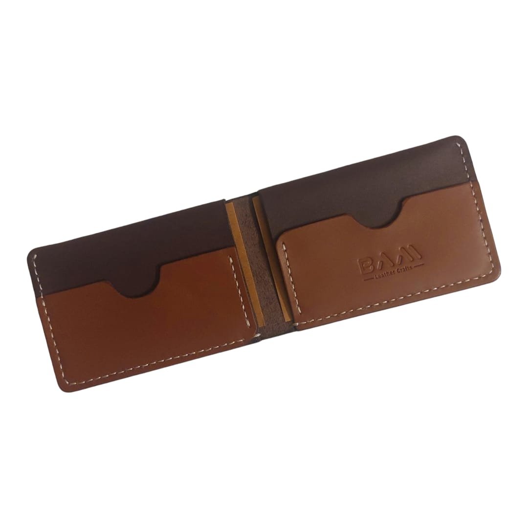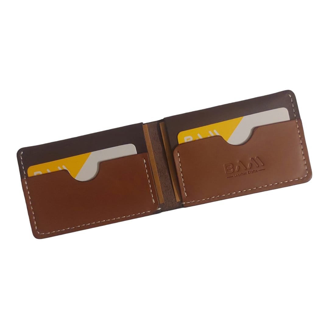 Bifold card holder having 2 card slots and 2 hidden pockets.