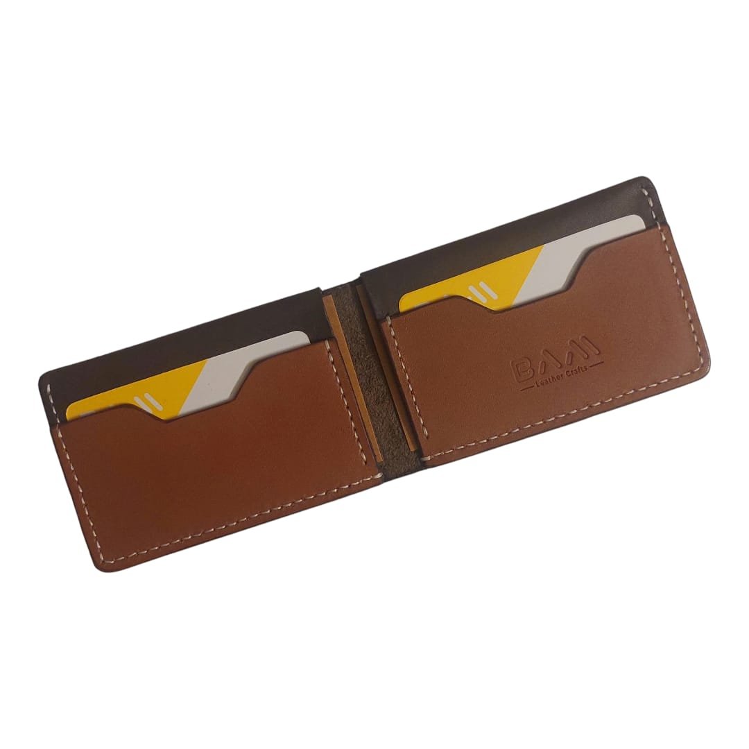 Bifold card holder having 2 card slots and 2 hidden pockets.