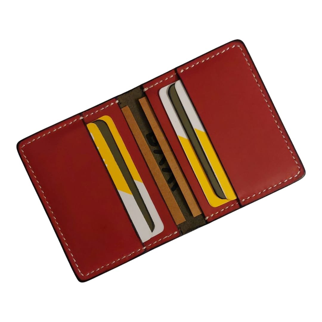 Bifold card holder having 4 card slots and 2 hidden pockets.