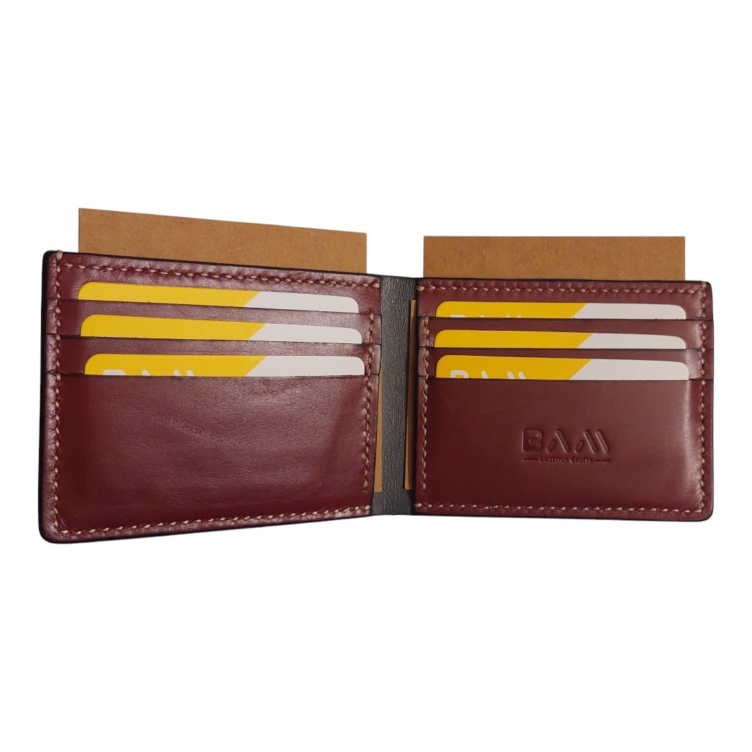 Bi-fold wallet having 6 card slots, 2 hidden  pockets and 1 cash compartment.