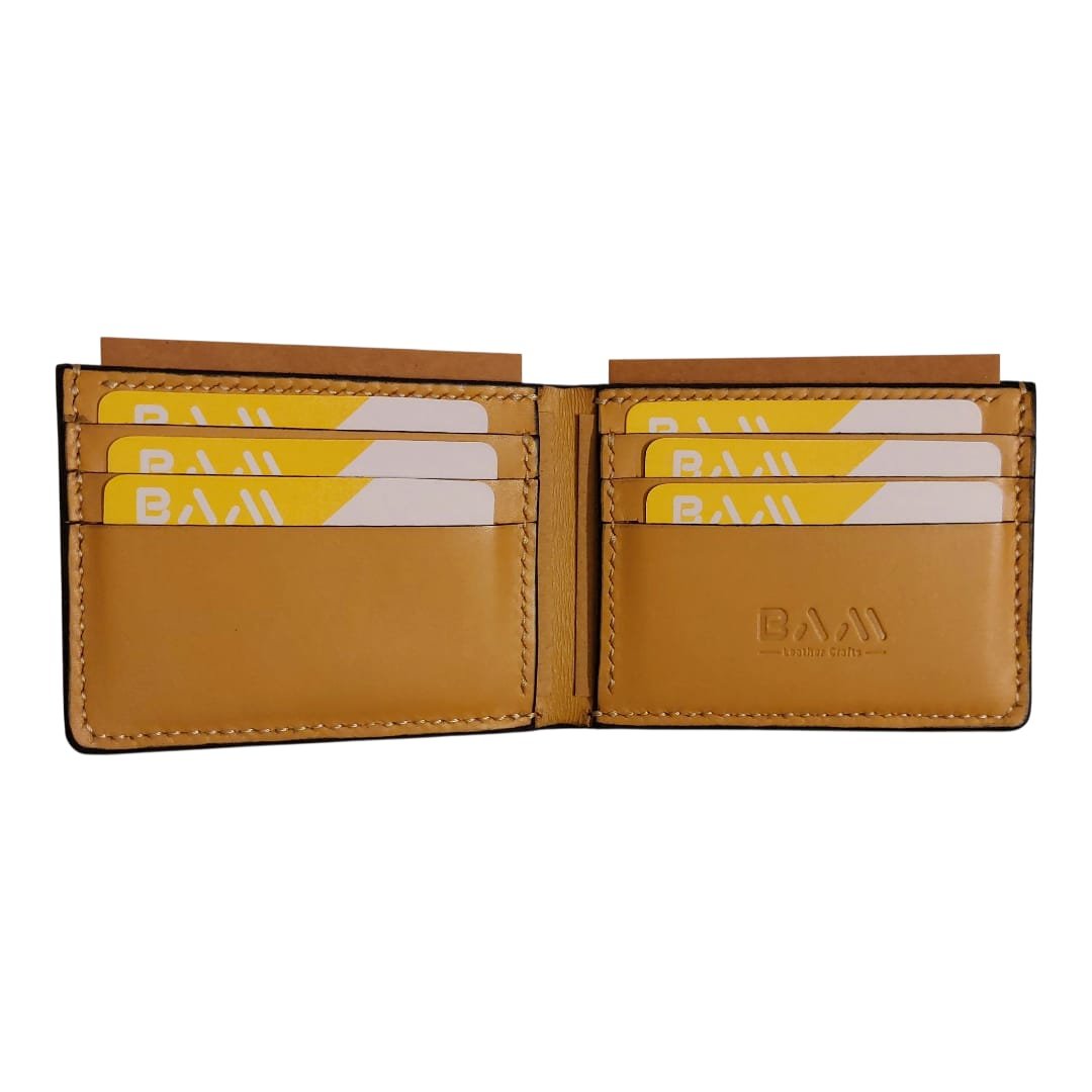 Bi-fold wallet having 6 card slots, 2 hidden pockets and 1 cash compartment.