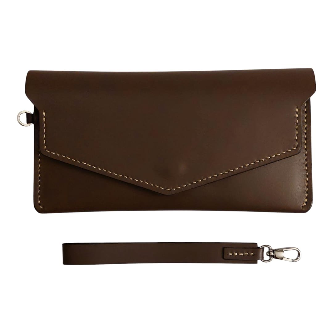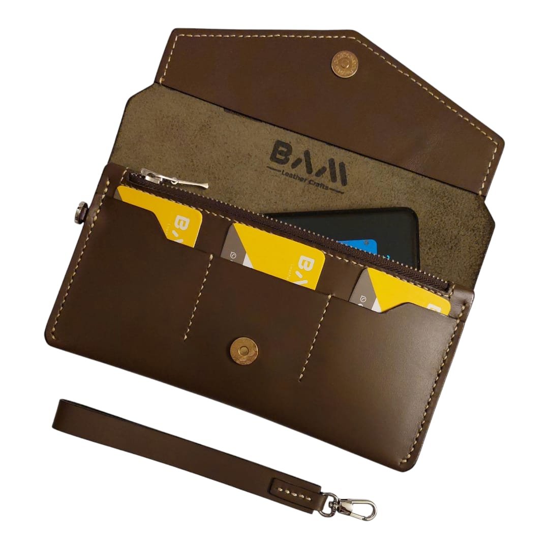 Clutch bag having 3 card slots, 1 cell phone and 1 cash pocket with metal zip.