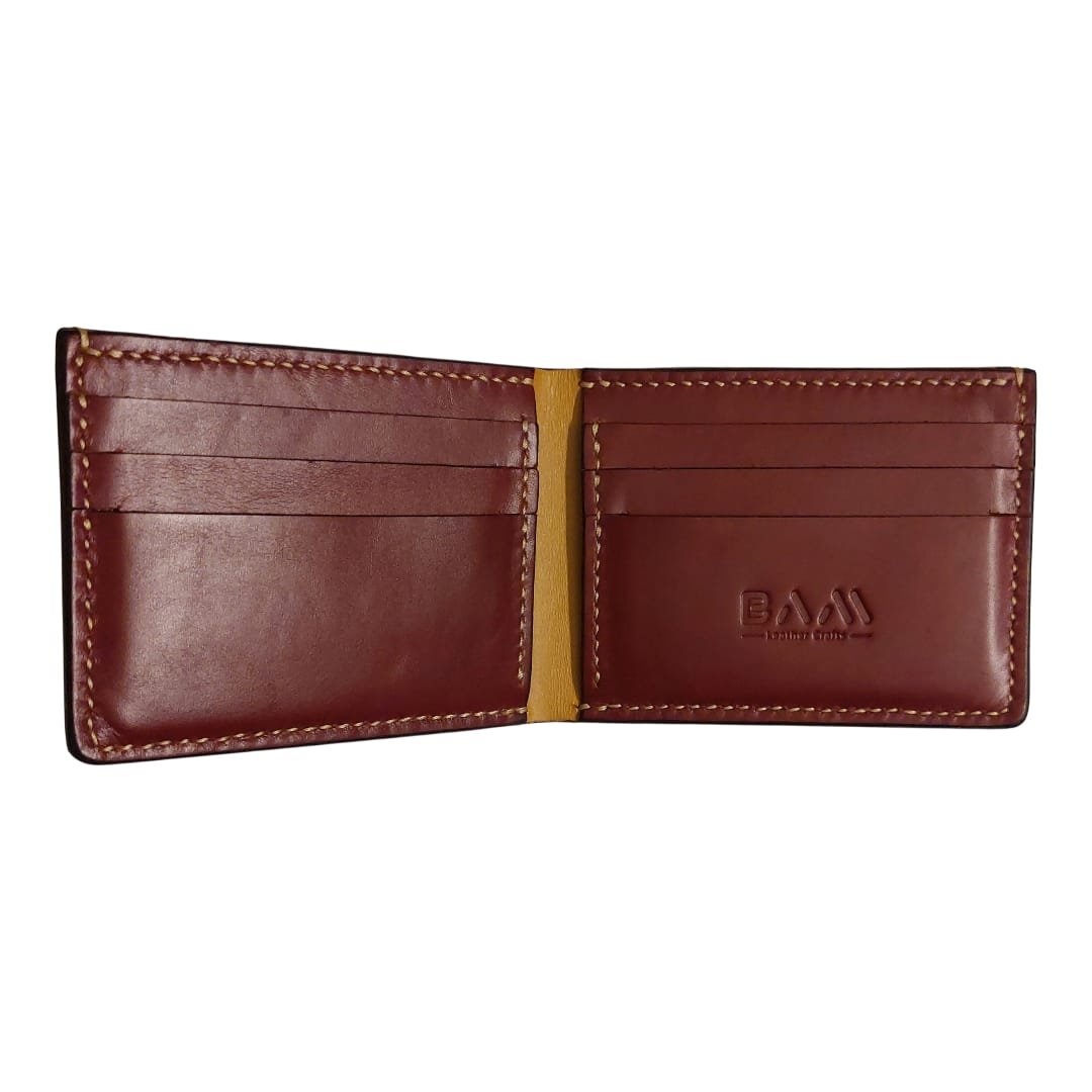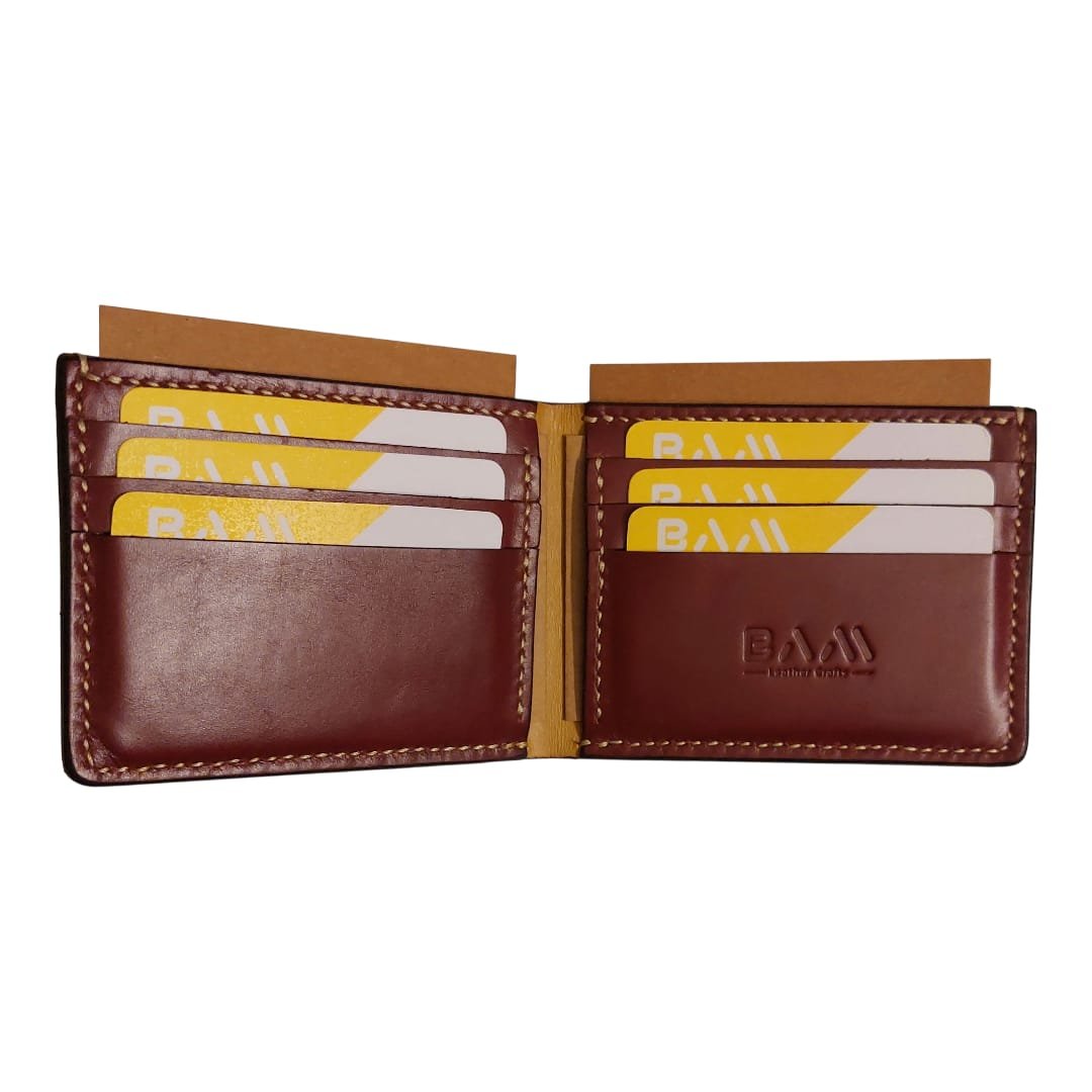 Bi-fold wallet having 6 card slots, 2 hidden pockets and 1 cash compartment.