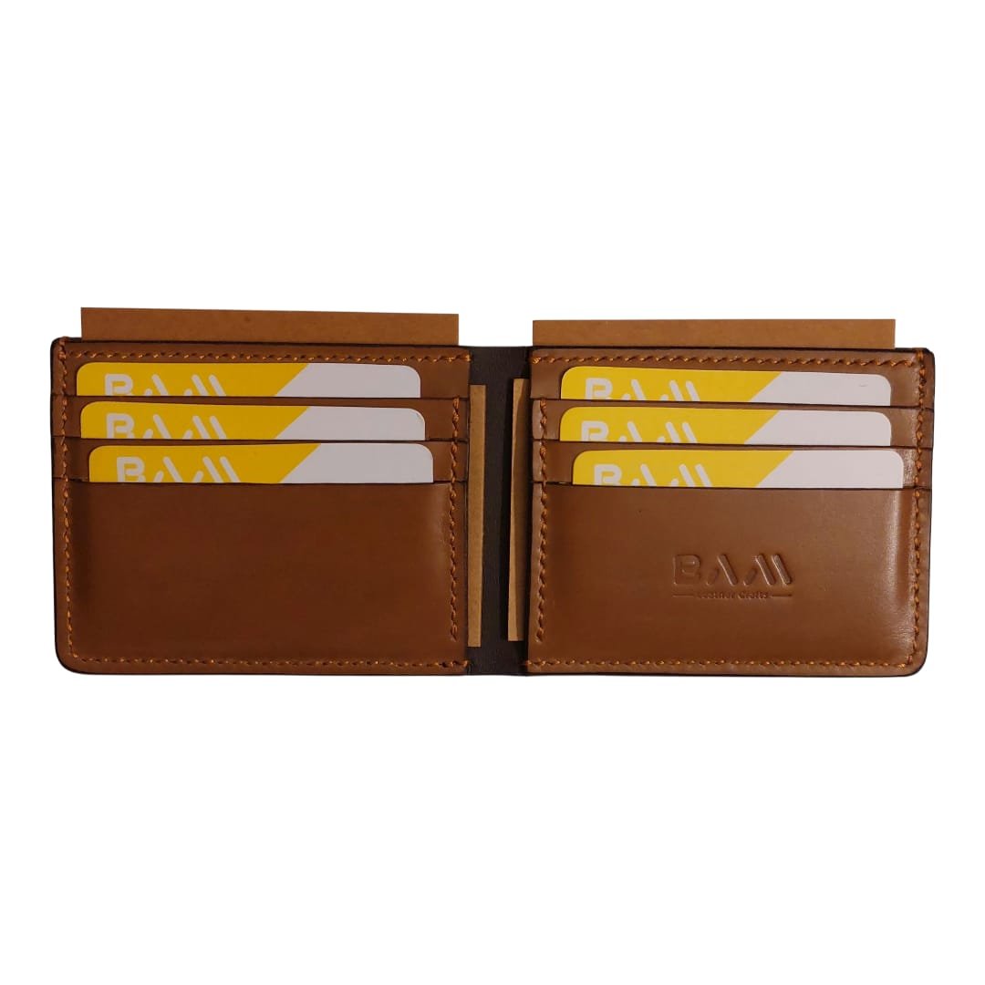 Bi-fold wallet having 6 card slots, 2 hidden  pockets and 1 cash compartment.