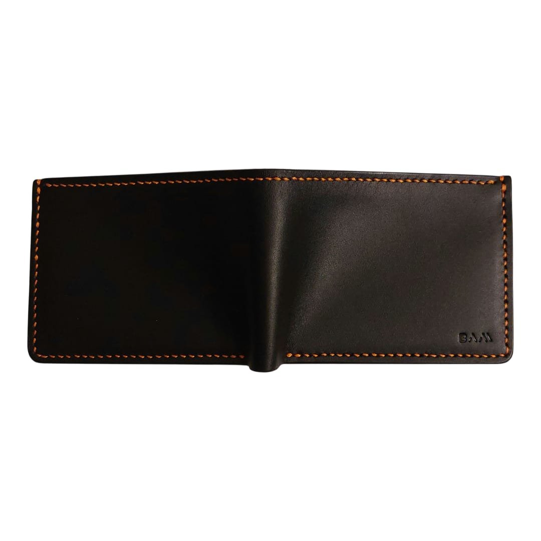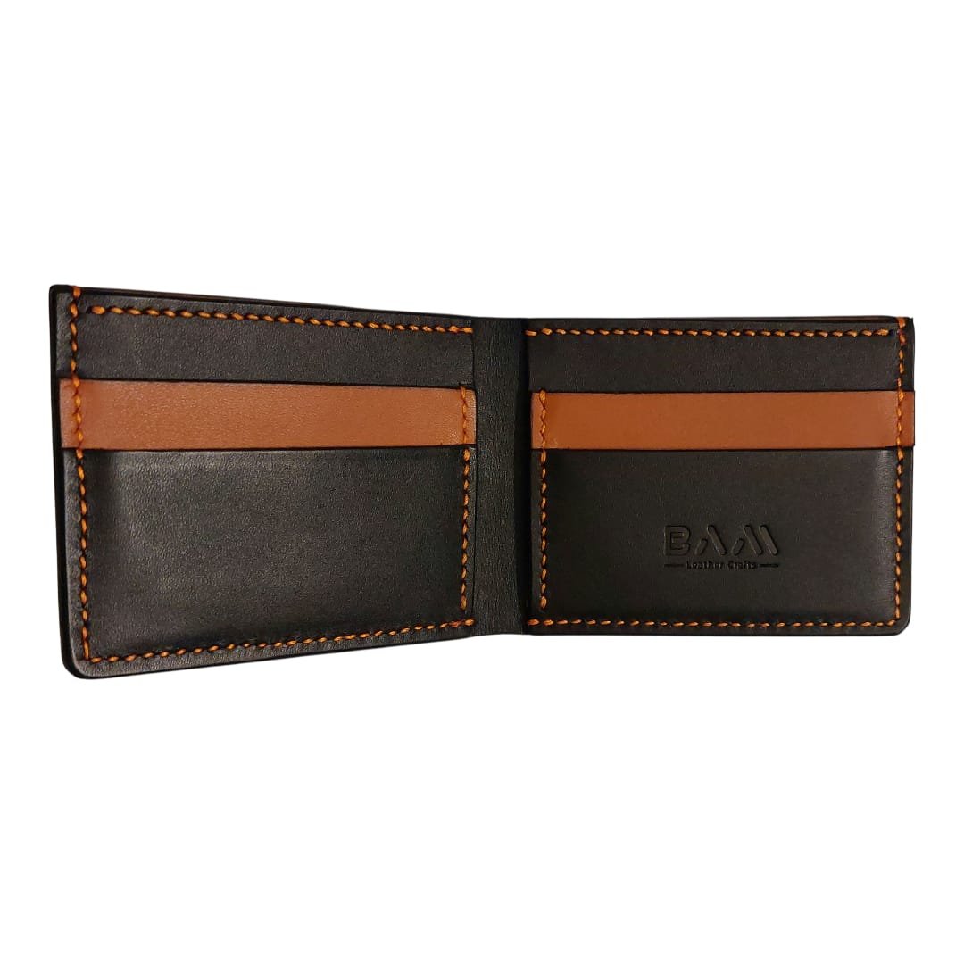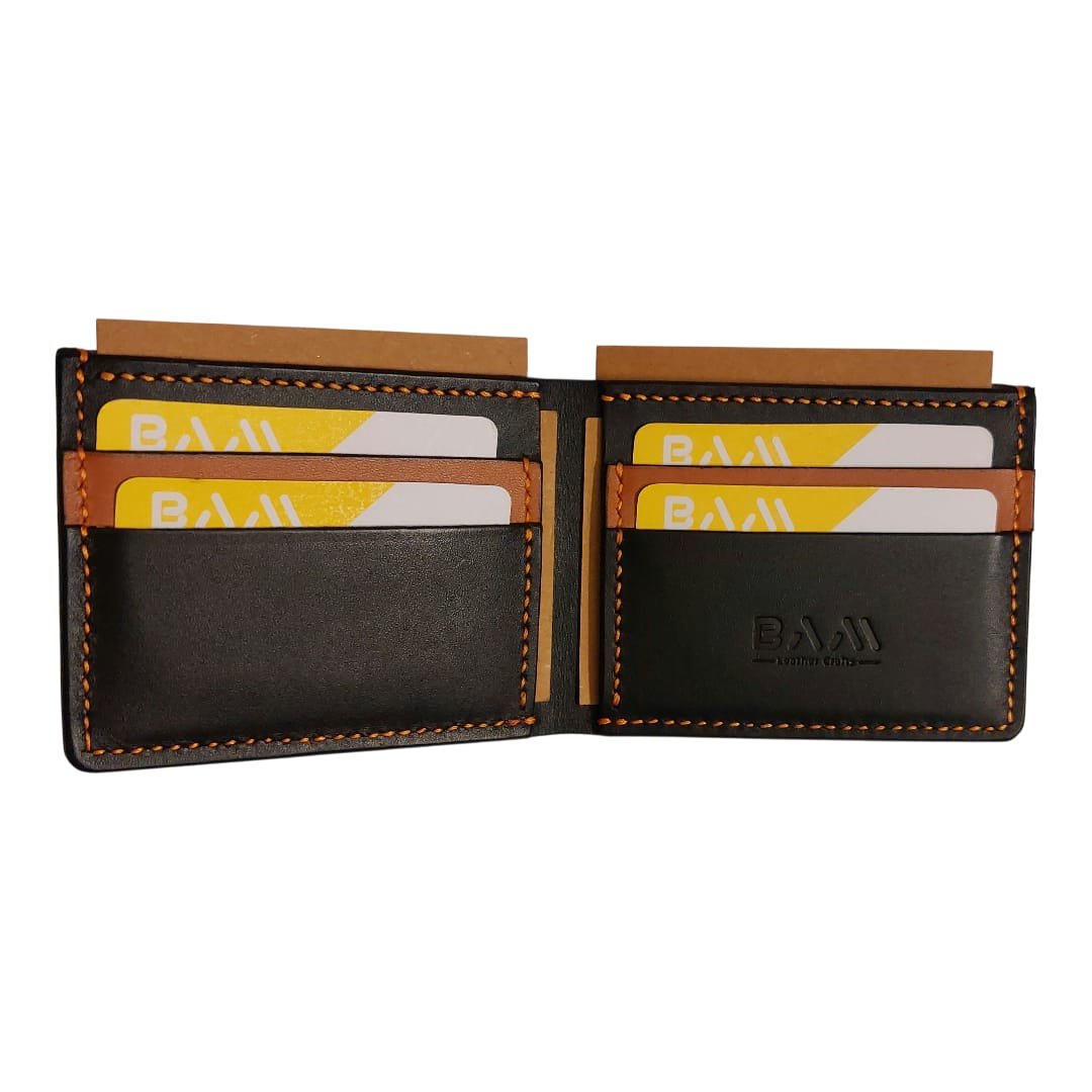 Bi-fold wallet having 4 card slots, 2 hidden pockets and 1 cash compartment.