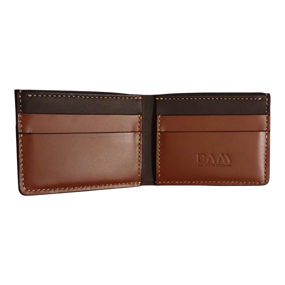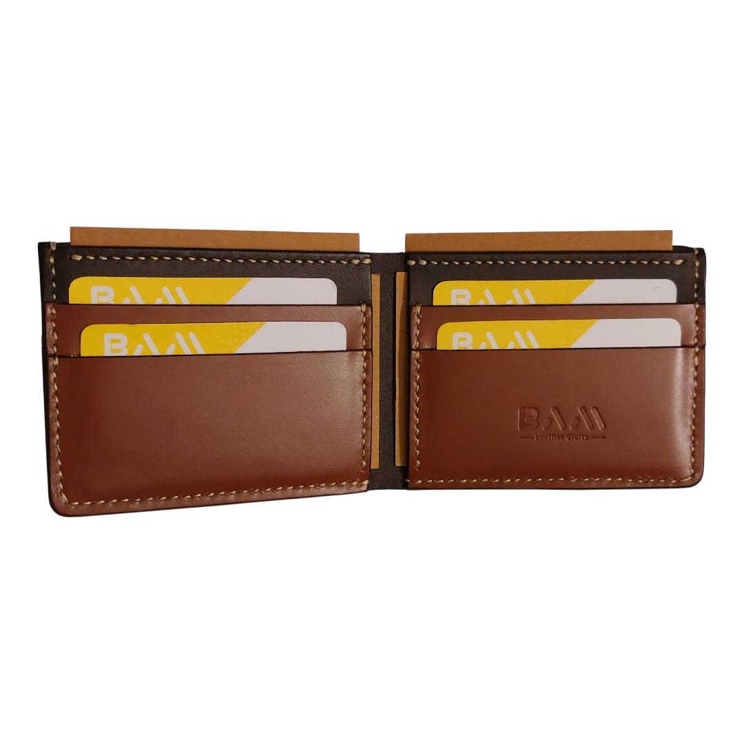 Bi-fold wallet having 4 card slots, 2 hidden pockets and 1 cash compartment.