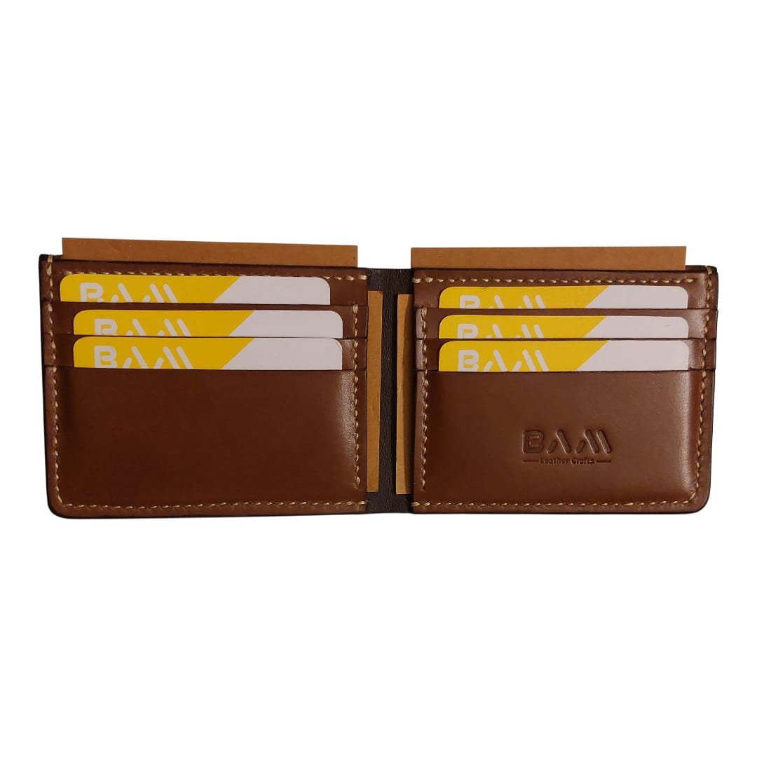 Bi-fold wallet having 6 card slots, 2 hidden pockets and 1 cash compartment.