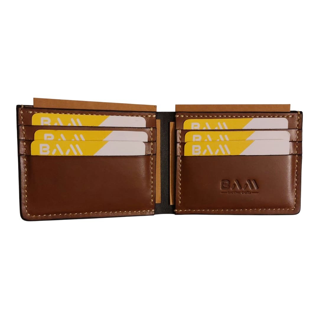 Bi-fold wallet having 6 card slots, 2 hidden pockets and 1 cash compartment.